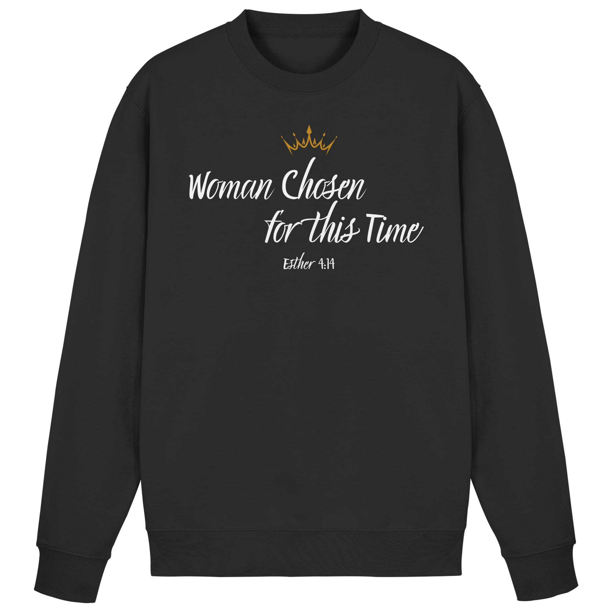 Descubra o poder da autoexpressão com nosso sweatshirt exclusivo "Woman Chosen for this Time". Este design único combina elegância e significado, destacando uma coroa dourada e uma mensagem inspiradora em letras fluídas.