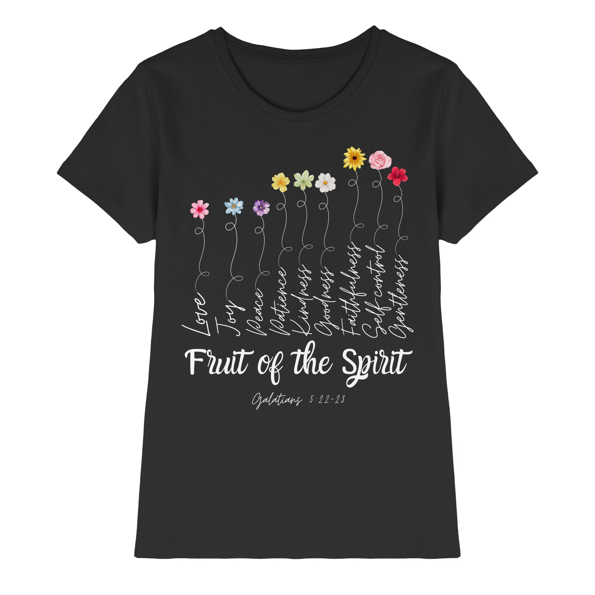 Descubra a elegância e o simbolismo em nossa T-Shirt Premium Feminina, uma peça única que combina moda e espiritualidade. Com um design encantador de flores coloridas simbolizando os frutos do Espírito, esta camiseta traz uma mensagem de amor e paz.